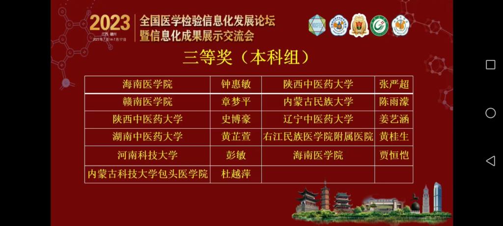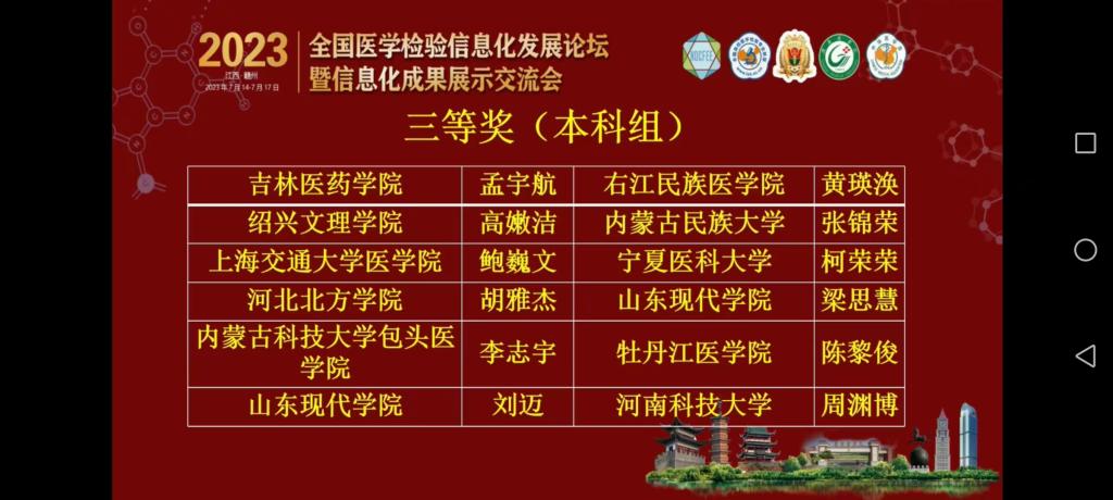 由高等学校国家级实验教学示范中心联席会、全国高等医学教育医学检验专业校际协作会、全国高等学校医学检验技术专业联盟、南方医科大学、赣南医学院主办,中华医学会检验分会协办的2023年全国医学检验信息化发展论坛暨信息化成果展示交流会,于7月14日至17日在江西赣州举办。会议期间同步进行学生形态学、虚拟仿真临床实验诊断、教师金微课等大赛交流活动。我院师生在形态学、虚拟仿真临床实验诊断、教师金微课等大赛中以扎实的功底和专业的素养荣获佳绩。