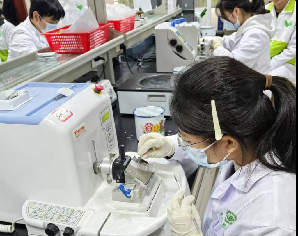 本次比赛的参赛人员为我校医学实验技术专业的全体学生及实习生共64人。评委团队由来自临床病理诊断与研究中心的5位专家组成,包括诊断医生及技术人员,严格按照评分标准,从切片的完整性、厚度均匀性、组织结构清晰度等多个维度进行综合评定。比赛要求参赛者在规定时间内完成一系列复杂的石蜡切片操作,包括切片及HE染色等步骤,最终由5位评委通过显微镜下的切片质量来评判成绩。此次比赛不仅是对学生技能的一次全面检验,更是对他们未来职业生涯的一次重要铺垫。