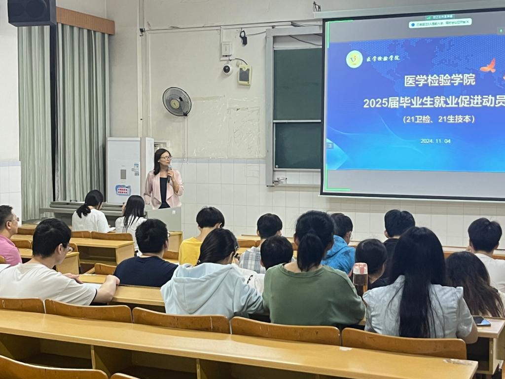 11月4日晚,医学检验学院在5栋506、507、603、604教室分班级召开了2025届毕业生就业促进动员会。学院副院长庞雅琴、副书记梁楚晗、副院长韦贵将、各班就业指导老师以及21级各专业毕业生参加了会议。