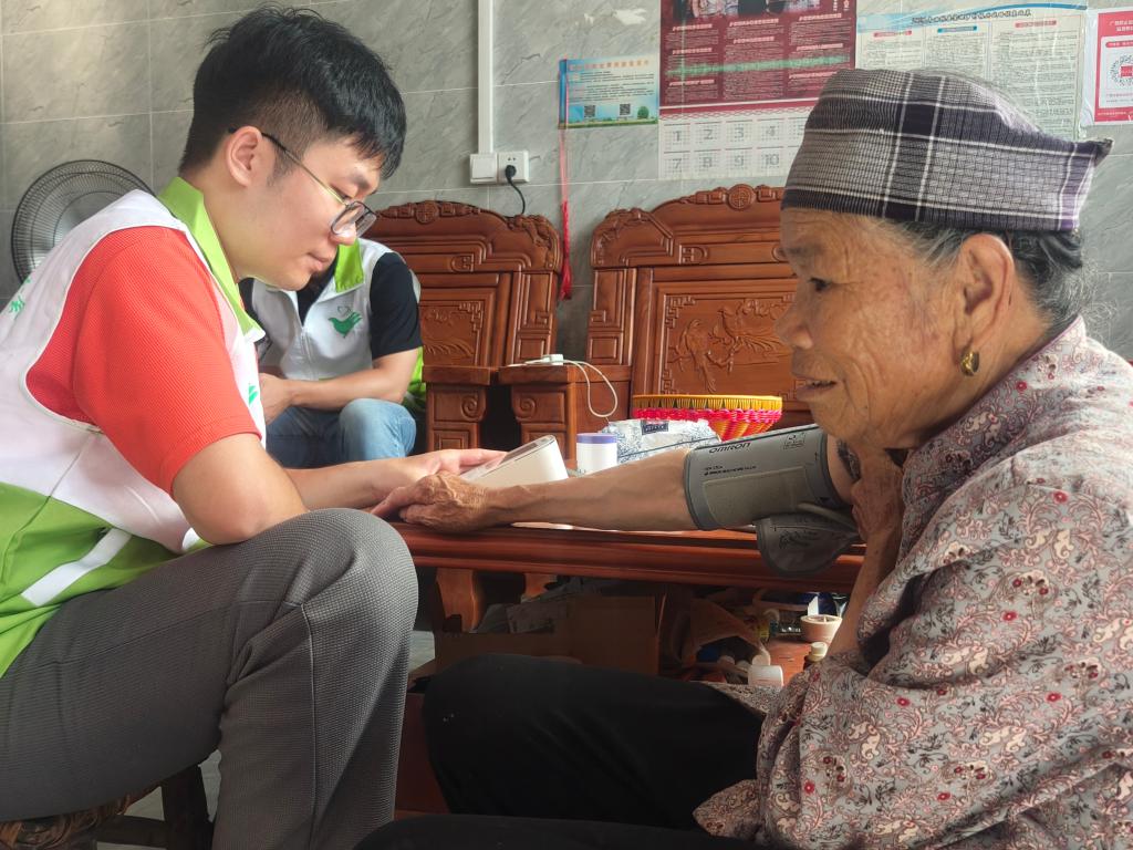 在高血压防治知识宣讲环节:通过图文展板、方言短视频、互动问答等形式,重点讲解高血压的危害、早期防控重要性及健康生活方式。团队为村民提供免费血压测量服务,并结合测量结果进行一对一风险评估和生活方式指导。据统计,此环节共有80余位村民参与血压测量,宣讲覆盖村民达150余人次。