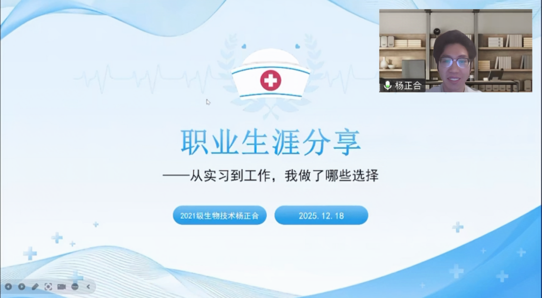 本期论坛邀请2025届生物技术专业毕业生、尖果生物科技(深圳)有限公司的杨正合担任主讲。他以“从实习到工作,我做了哪些选择?”为主题,结合自身经历,深入剖析实习阶段心理适应与情绪管理的重要性。杨正合坦言,职场新人常面临环境适应难、工作压力大、角色转换不畅等挑战。他分享自己实习时,通过积极调整心态,化压力为动力;主动学习沟通技巧,与同事领导建立良好关系,最终实现从实习生到正式员工的平稳过渡,其分享让学生们感受到职场成